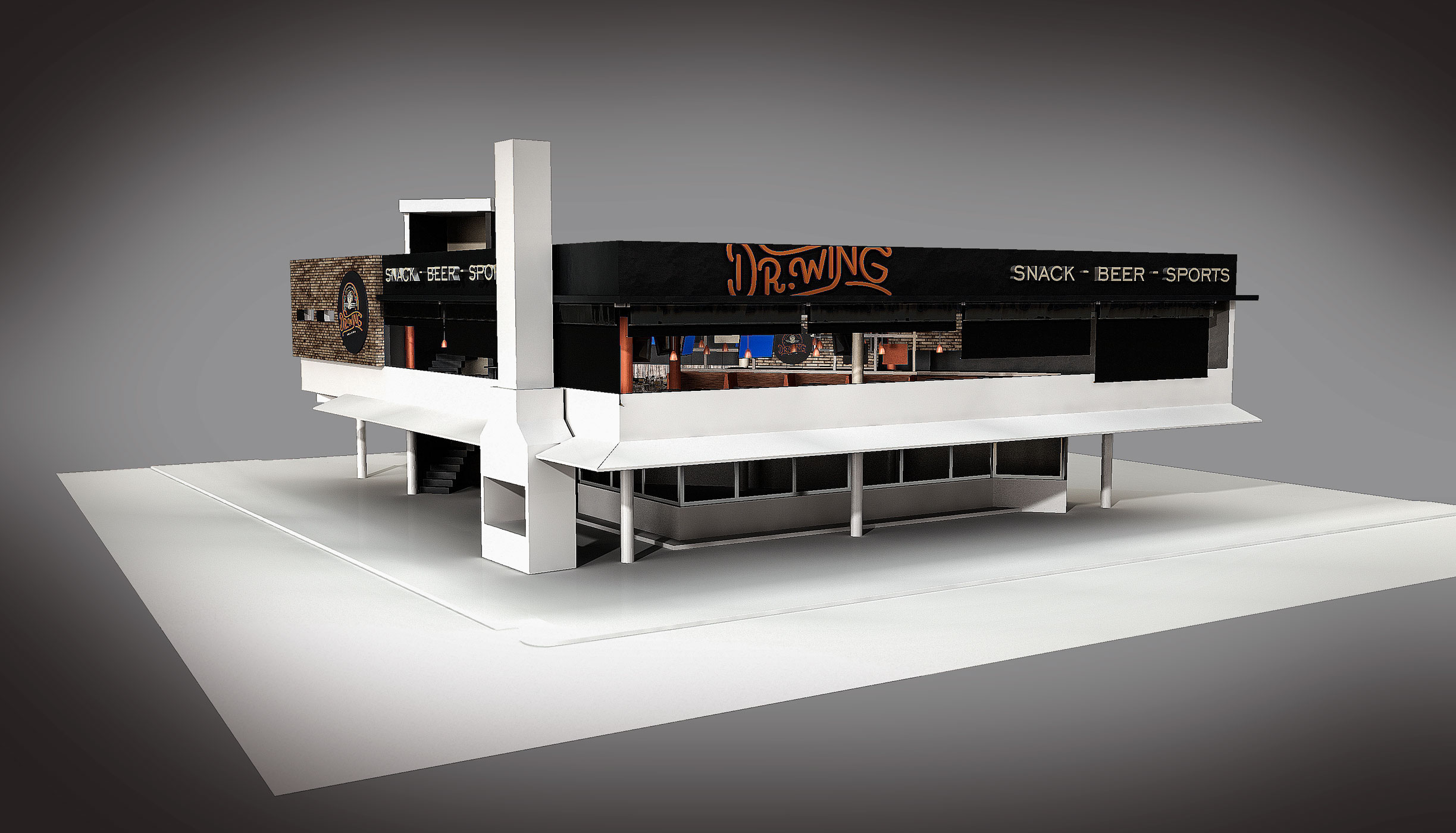 Dr. Wing como su nombre lo indica es un restaurante de alitas con el cual participamos en el desarrollo de toda la identidad corporativa incluida la aplicación corporativa del interior y exterior del punto de venta.